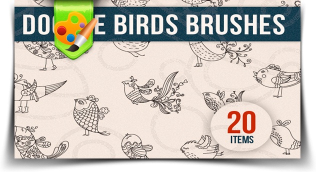 В данной раздаче представлен набор кистей для фотошопа «Сказочные птицы». Все оттиски кистей в виде рисованных от руки птичек, чем-то похожих на рыб, представлены в очень хорошем качестве — 2400 на 2500 пикселей. Всего в архиве 20 штук в формате abr.